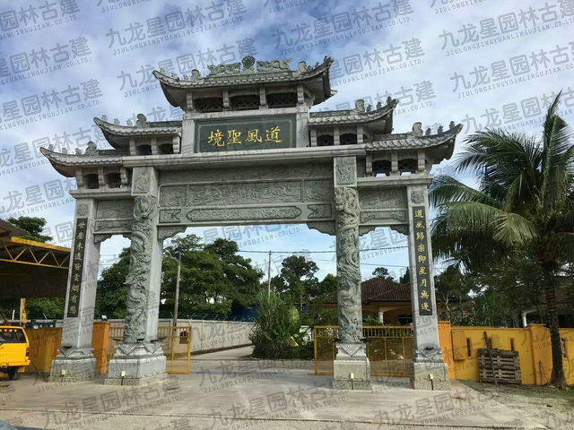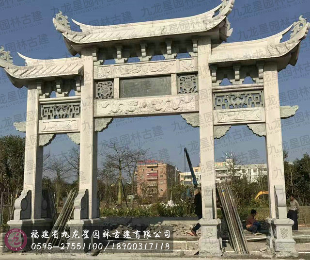牌坊集中了中國(guó)古建筑最有特征的構(gòu)件組成,有臺(tái)座、柱身(包括夾桿石)、梁坊、樓匾、斗拱、樓頂?shù)葮?gòu)件。石造牌坊材質(zhì)堅(jiān)固敦實(shí)牢靠,且可仿照木結(jié)構(gòu)造型。在藝術(shù)處理上,可以在夾桿石、柱子、額坊等處,雕刻各式各樣的花鳥(niǎo)、圖案、龍鳳及各種瑞獸等等,將中國(guó)傳統(tǒng)的石刻藝術(shù)集中于一身表現(xiàn)出來(lái)。中國(guó)民俗專家講:“石雕不開(kāi)光是石雕工藝品,開(kāi)光后就是具有靈氣的風(fēng)水神器。”所以“非寧?kù)o無(wú)以致遠(yuǎn),非精誠(chéng)無(wú)以神明?!?石牌坊是用石修建的牌坊,是一種裝飾建筑物。柱石的上方刻有麒麟、獅子,夾柱石的浮雕有雙獅戲彩珠,牌坊上還雕刻著其他怪獸云紋。兩側(cè)基石柱各有撐鼓,石柱兩側(cè)配有石獅。牌坊運(yùn)用浮雕、透雕等手法,是我國(guó)建筑藝術(shù)的一大特色。