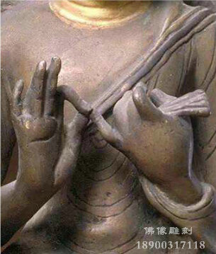 1.說法印,以拇指與中指(或食指、無名指)相捻,其余各指自然舒散。這一手印象征佛說法之意,表現(xiàn)佛陀于鹿野苑初轉法輪時的狀態(tài),所以稱為說法印,也稱轉法輪印。