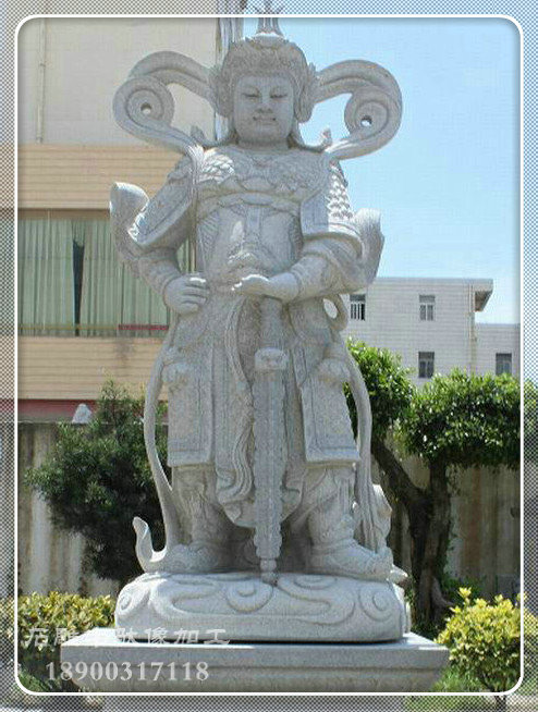 在中國的寺院殿宇里原印度血統(tǒng)的韋馱已經(jīng)被漢化,成了一名地道的中國武將,他身披鎧甲,手持金剛杵,降魔去妖,威風凜凜英俊威武。天王殿中所塑的韋馱形象,一般具有兩種站立的姿態(tài):一個是雙手合十,降魔杵橫于腕上,直挺而立;一個是一手握杵拄地,另一手叉腰。前者雙手合十,表示此地是十方叢林,歡迎來客,遠游的行腳僧可安心住下。后者則示本寺不接待來僧掛單,行腳僧最好另投山門。