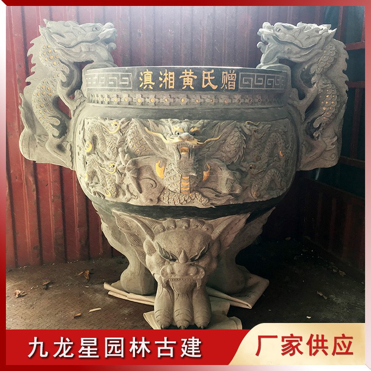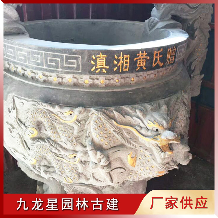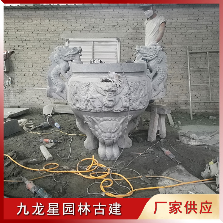 石雕香爐造型有圓形和方形,方形的香爐多為四足,圓形的香爐有三足,兩足在后一足在前。此款石雕九龍香爐雕刻虎爪底足、九龍環(huán)繞的爐身手工打造。俗話說九龍進家,富貴榮華,祖祠擺入九龍香爐不僅可以助運家族興旺,還象征著吉祥如意。