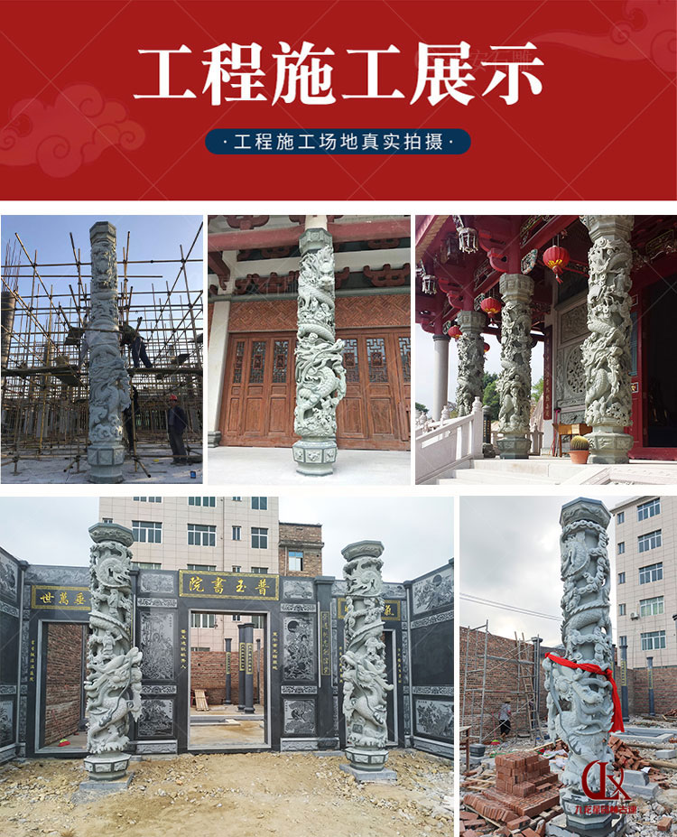 福建廠石雕龍柱產(chǎn)品構(gòu)成為柱礎(chǔ)、柱身、柱頭(柱帽)三部分,龍柱一般為圓柱形,通身雕刻有纏柱云龍,適用于宮觀寺院、宗祠古厝、園林景觀、廣場(chǎng)擺件等,常用石料為花崗巖與青石。