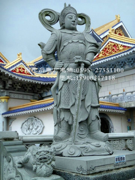 韋馱菩薩像常威武地立于最靠近寺院門口的四天王殿內(nèi),面向寺院,以守護(hù)道場(chǎng)。其形像大多為身穿甲胄的雄壯武將,手持金剛杵,或以杵柱地,或雙手合十,將杵擱于肘間。韋馱菩薩現(xiàn)天大將軍身擔(dān)當(dāng)佛教中驅(qū)除邪魔,保護(hù)佛法的重任,為佛教中護(hù)法金剛力士的代表之一.