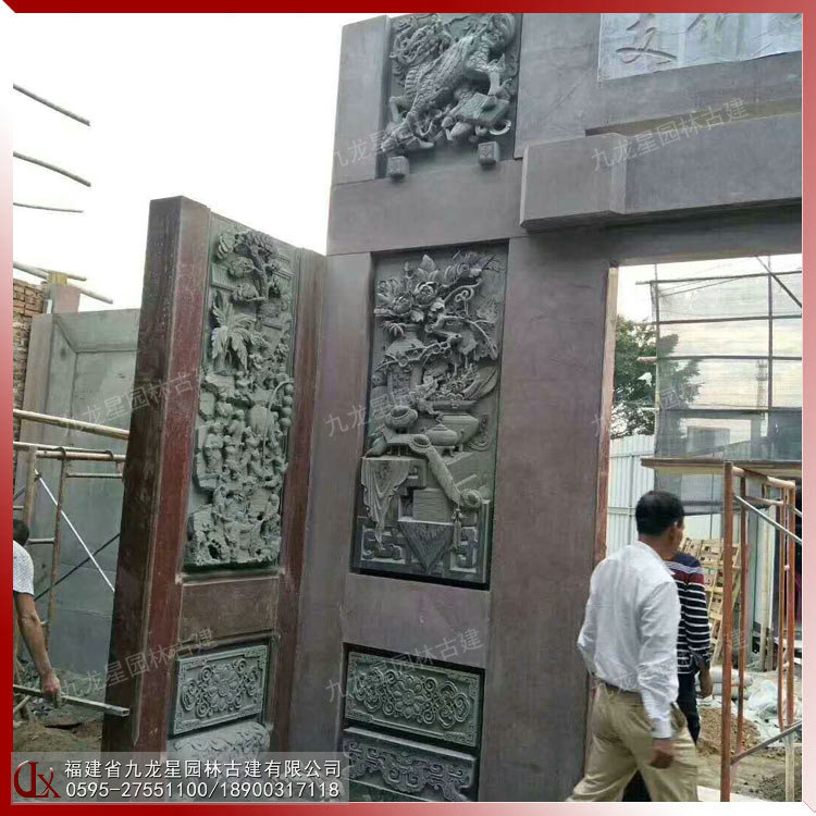 石雕浮雕壁畫在潮汕祠堂中占了重要的地位。宗祠門面浮雕在內(nèi)容、形式和材質(zhì)上與圓雕一樣豐富多彩。下圖是九龍星園林古建案例-潮汕祠堂門面獅象浮雕圖 浮40公分。